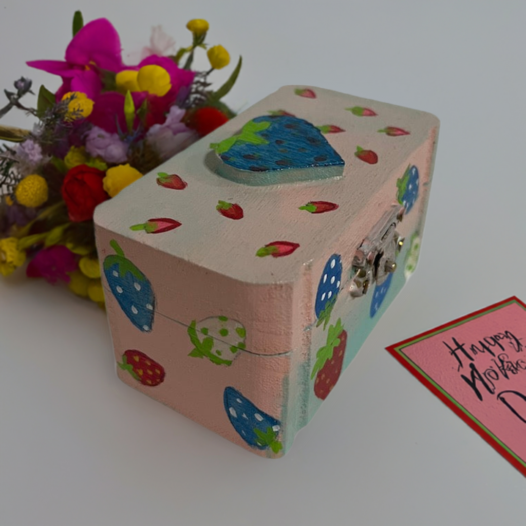 A beautiful box with hand painted strawberries in shades of red blue and white make it a perfect valentine gift box.