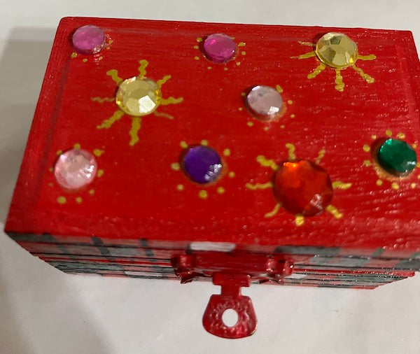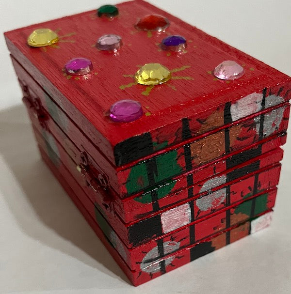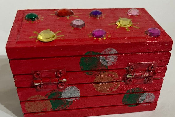 - Features: - Hand painted wood box - Red finish and colorful gem stone accents