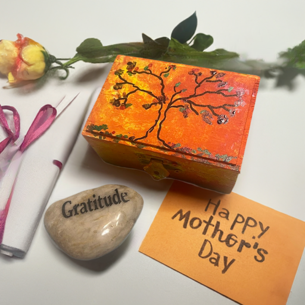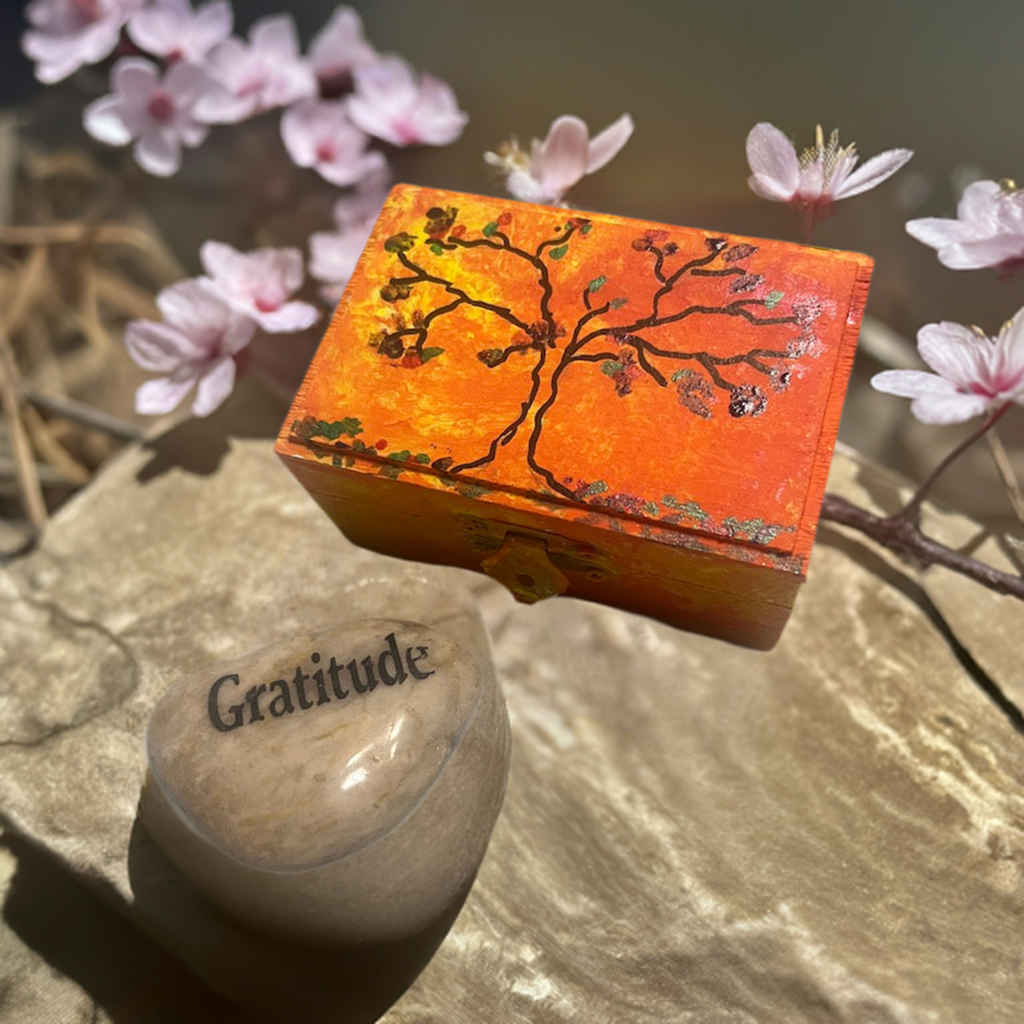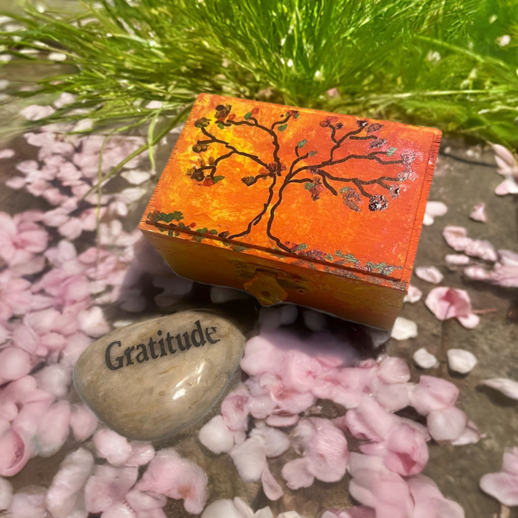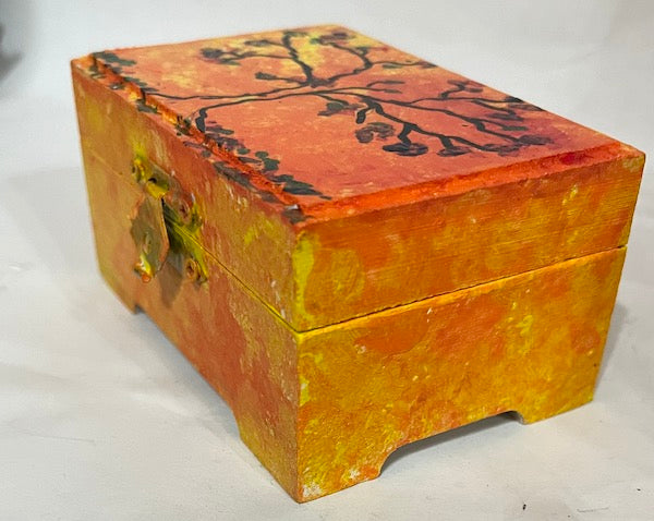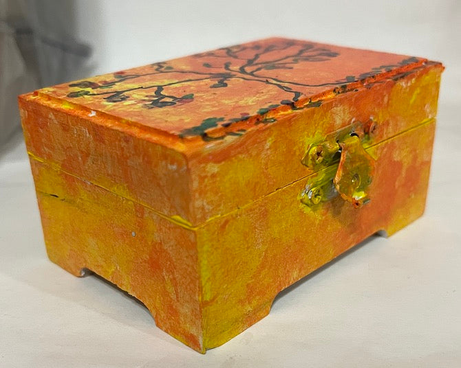 An orange and yellow shaded box painted with a simple yet bold tree, standing out giving this box a classic look.