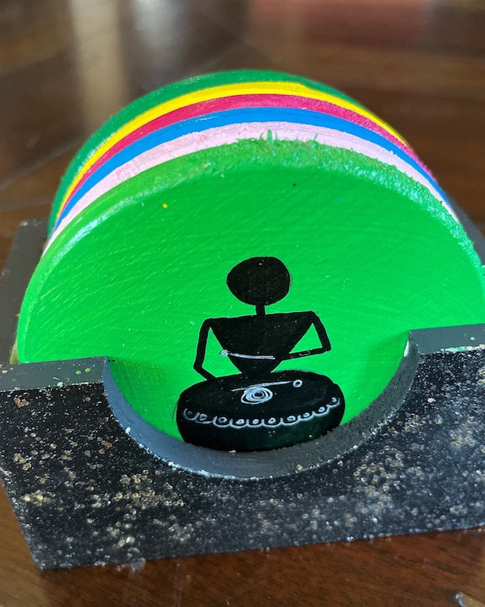 A bright and colorful hand painted set of round wooden coasters- set of 6 comes with a black sparkly holder.